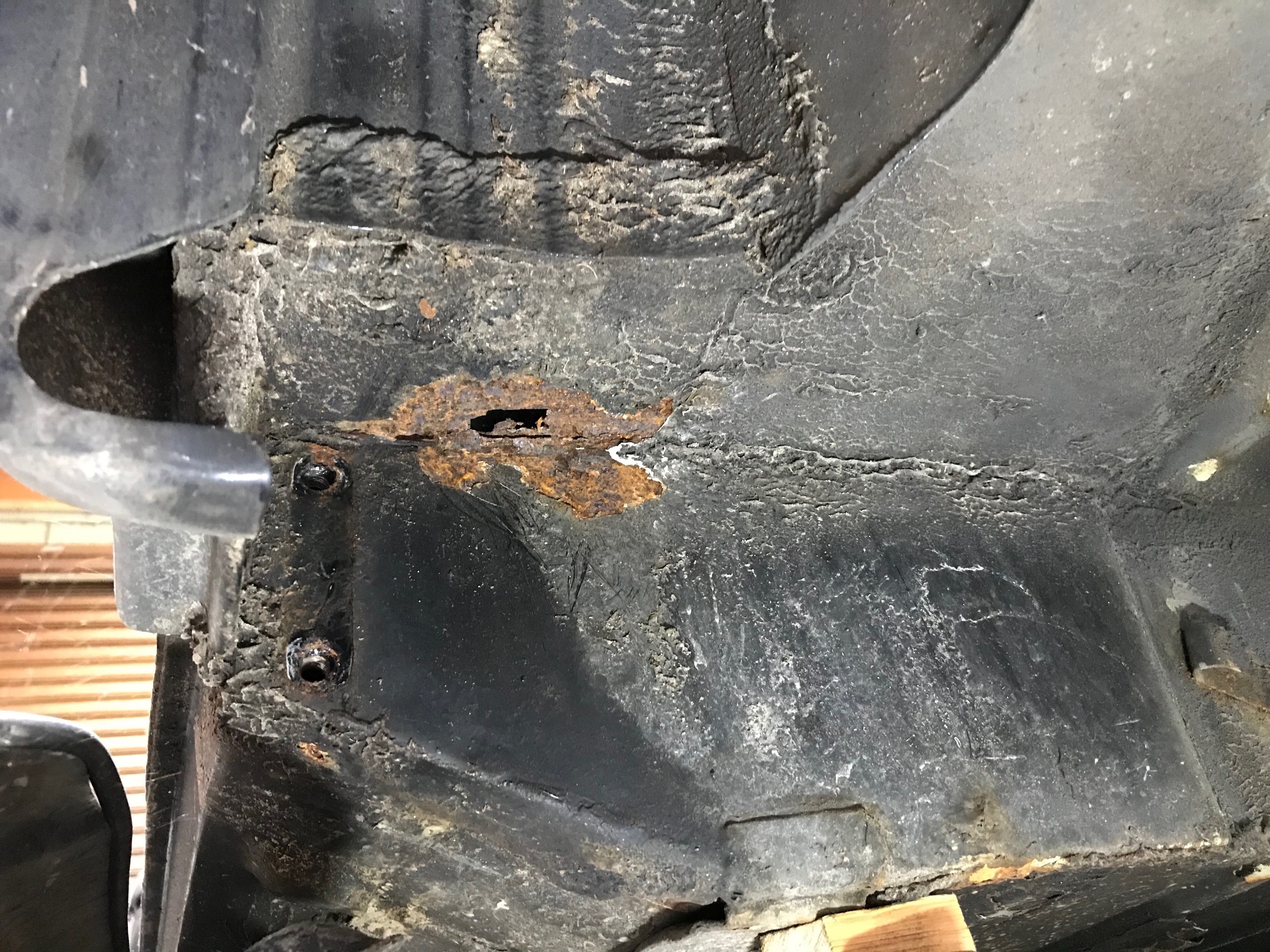 Jaren zand en vocht hebben zich door het staal heen gevreten met een klein gaatje als gevolg.